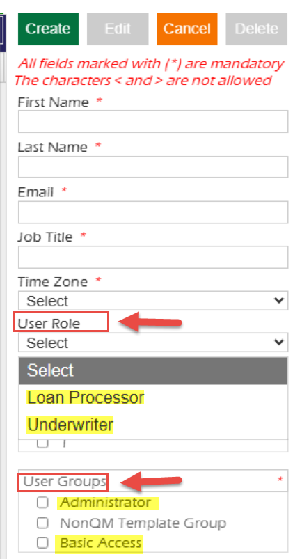 - User Role: To assign a Role to the User. Use the dropdown to choose either "Loan Processor" or "Underwriter". NOTE: Assigned roles don't give the user administrative access.