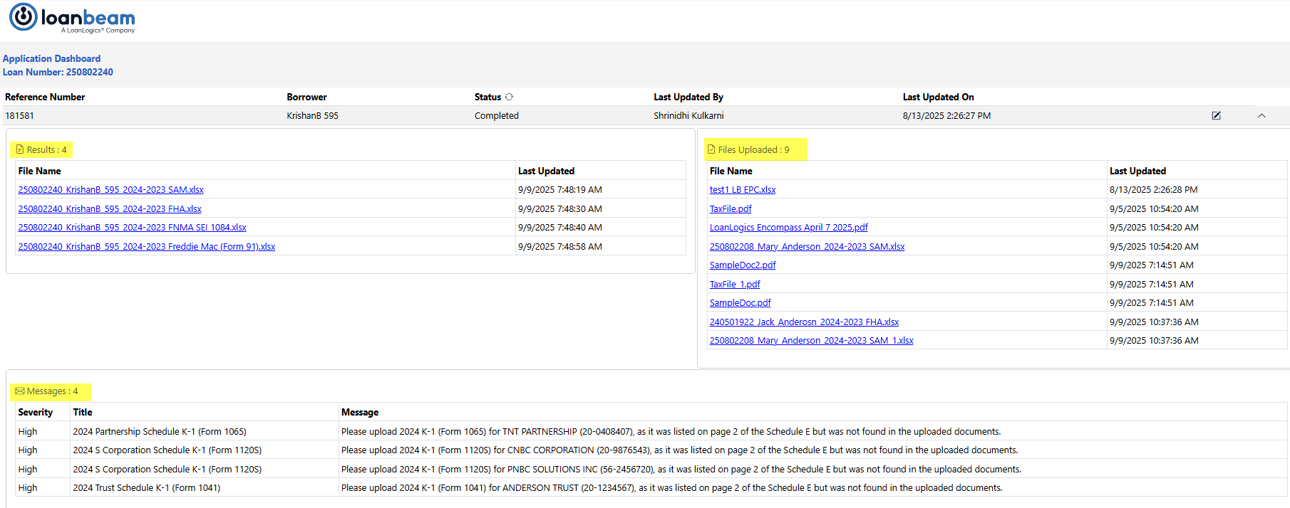 After clicking View Details, the results (all Excel worksheets selected), messages, and uploaded documents will appear in the integrated LoanBeam Encompass Dashboard -