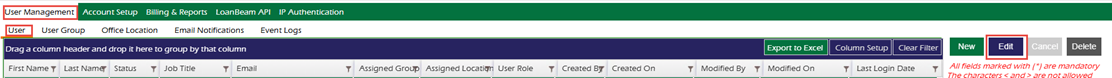 To edit an existing LoanBeam user or to create a new LoanBeam admin user, Login to LoanBeam and access the ADMIN section. On the User tab you can choose to EDIT the user group of a current user (to make them an Administrator) or to add a NEW Admin user.